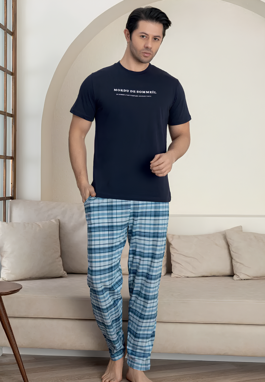 Гармонійне поєднання однотонноі футболки із мінімалістичним написом французькою та штанів у вишукану клітинку створює стильний образ навіть удома. Фраза "MORDU DE SOMMEİL. UN SOMMEIL FORT POUR UNE JOURNEE FORTE." – це не просто слова, а філософія: "Спіть міцно. Міцний сон для сильного дня."