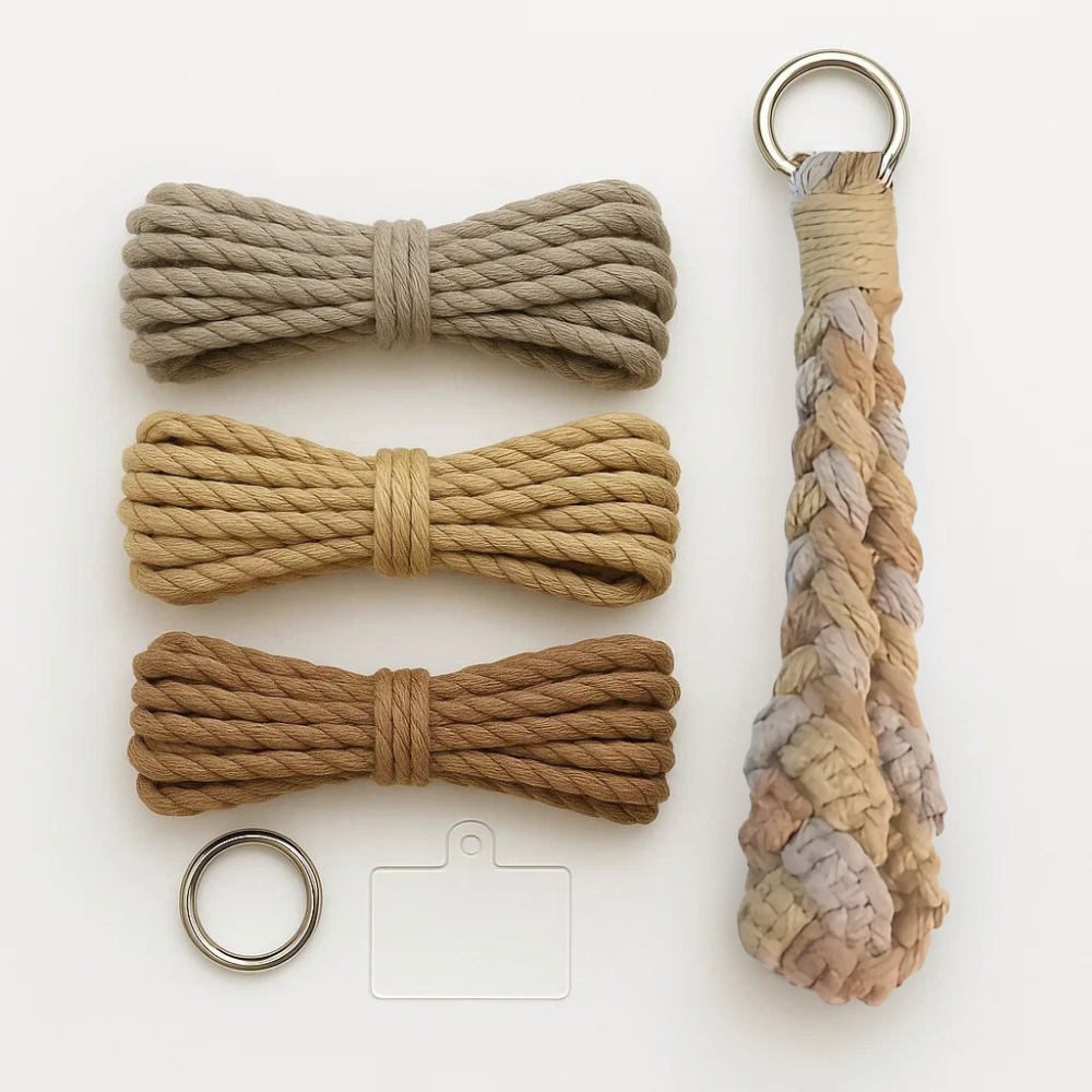 Зробіть стильний та практичний аксесуар власноруч! Цей набір дозволяє сплести брелок у вигляді косички з зручною петлею на зап’ястя. Природні відтінки – сірий, бежевий і коричневий – легко поєднуються з будь-яким стилем.