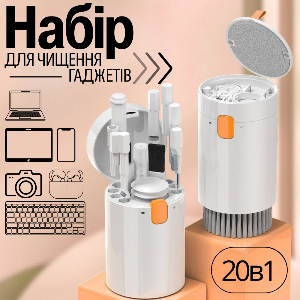 Набір аксесуарів для чищення гаджетів 20 в 1 — універсальний комплект для догляду за смартфонами, ноутбуками, планшетами, навушниками, камерами та іншою технікою. У набір входять щітки різного розміру, спрей для дисплея, серветка, інструменти для чищення клавіатури і навушників, а також зручна ємність для зберігання. Завдяки багатофункціональним насадкам легко доглядати за важкодоступними місцями: клавішами, об'єктивами, портами і відділеннями для навушників. Комплект допомагає продовжити термін служби пристроїв і зберігає їх чистими і акуратними.
